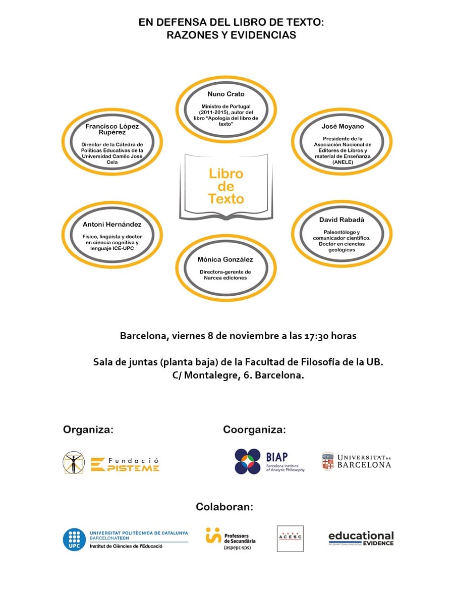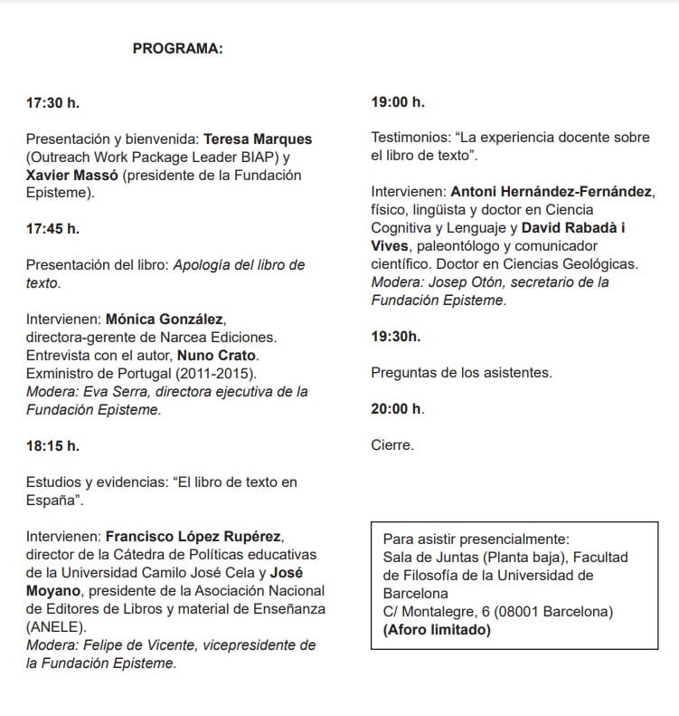 Con motivo de la reciente publicación del libro Apología del libro de texto (Narcea, 2024), la Fundación Episteme, en coorganización con Barcelona Institute of Analytic Philosophy (BIAP) de la Universidad de Barcelona, organiza un encuentro presencial con su autor, Nuno Crato (Ministro de Educación de Portugal 2011-2015), así como con destacados expertos: Mónica González (Narcea), Francisco López Rupérez (UCJC), José Moyano (ANELE), Toni Hernández (UPC) y David Rabadà (aspepc·sps).