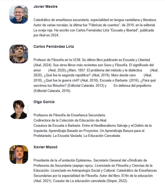 Tertulia en Fòrum Episteme con Javier Mestre y Carlos Fernández Liria, autores del libro Escuela y Libertad. Argumentos para defender la enseñanza frente a políticas educativas y discursos pedagógicos demenciales, una crítica para defender la función esencial de la escuela. Participan: Olga García y Xavier Massó.