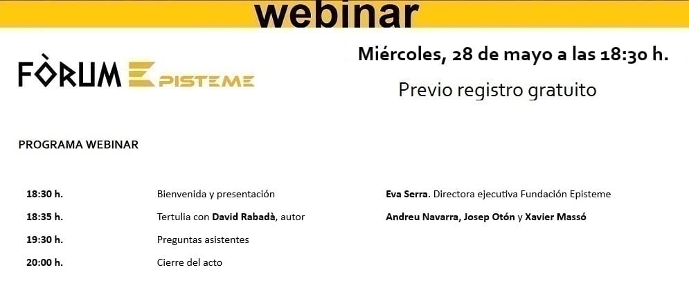 El miércoles, 28 de mayo: Tertulia con David Rabadà, autor de La educación basurizada. El cáncer de las pseudociencias en educación (Dobleuve). Participan los docentes y escritores, Andreu Navarra, Josep Otón y Xavier Massó. La cita, en Fòrum Episteme, comenzará a las 18:30 horas.