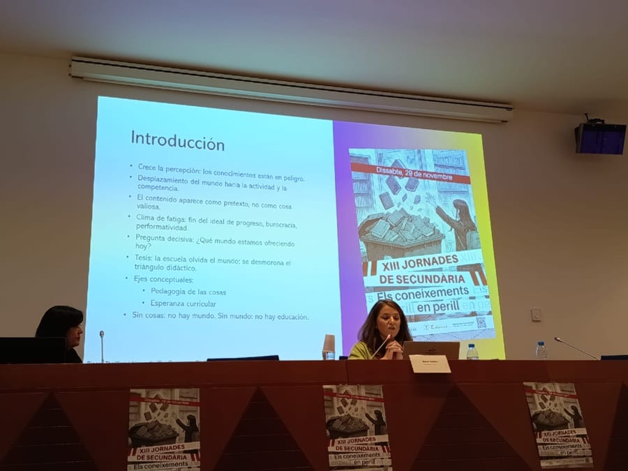 Ante un nutrido auditorio de profesores que sufren a diario el catastrófico vaciado de sentido de la tarea educativa, cuando ésta conlleva enseñar, sin el rigor ni el criterio lógico y estructurado del conocimiento, materias asoladas por la sistemática reducción de contenidos, a la que se ven abocados por las medidas de las autoridades educativas y los colectivos pedagogistas que los asesoran, cuatro voces de mundos tan diversos como los de la teoría de la educación, el periodismo, la filosofía y la climatología han defendido la importancia de impartir contenidos de conocimiento en las aulas, si lo que se quiere es no desmaterializar el mundo (Bianca Thoilliez), no debilitar la democracia (John Carlin), recuperar la virtud y el autodominio personal a través de la ética clásica (Damià Bardera) y huir de la desinformación manipulativa de los medios y las multinacionales de la energía (Francesc Mauri), un sensato programa de dignificación de los saberes que tradicionalmente han fortalecido a la sociedad, dotándola de mecanismos de defensa contra la ignorancia, la falsedad y el interés espurio.